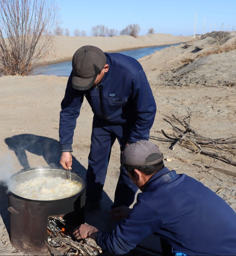 Унда иштирок қилаётган ишчи-ходимларга иш бошида иссиқ овқат ташкил қилиниб, объектларга бориб келишлари учун махсус тарнспортлар ажратилган. 6 январь куни Хўжайли туманидаги “Сувчилар боғи” ҳамда Кегейли туманидаги “Кўк ўзек” насос станциясида Қорақалпоғистон насос станциялари ва энергетика бошқармаси томонидан ҳашарчилар учун ош дамланди.