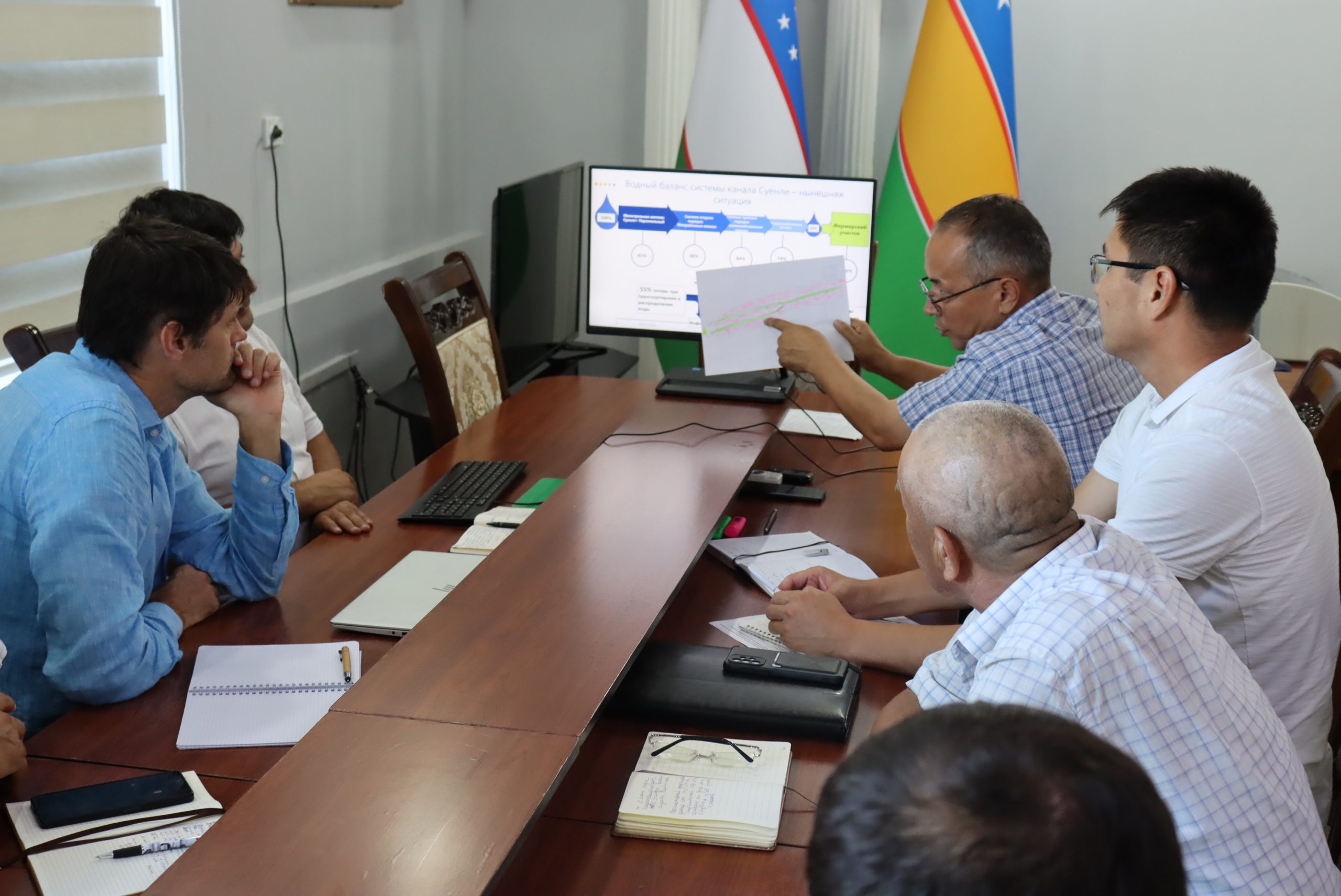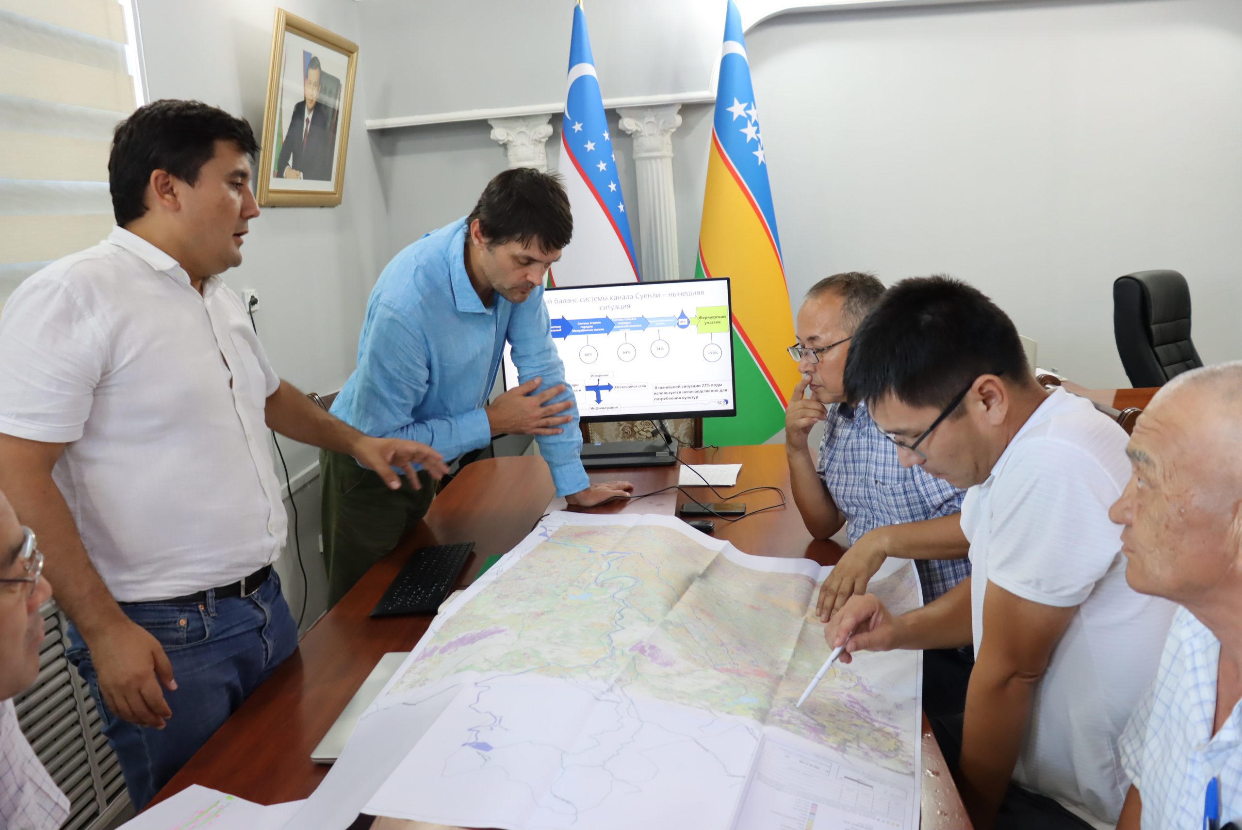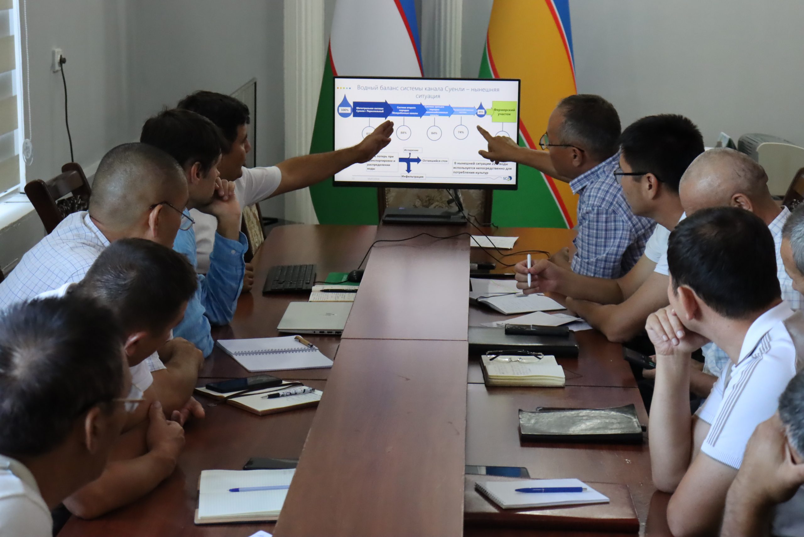 Шу ерда Қорақалпоғистон Республикаси Сув хўжалиги вазирлиги  ва Ўрмон хўжалиги қўмитаси  масъуллари иштирокида “Суенли каналини модернизация қилиш” ҳамда “Қорақалпоғистондаги деградатсияга учраган ерларни қайта тиклаш” лойиҳалари бўйича амалга ошириладиган муҳим вазифалар муҳокама қилинди.