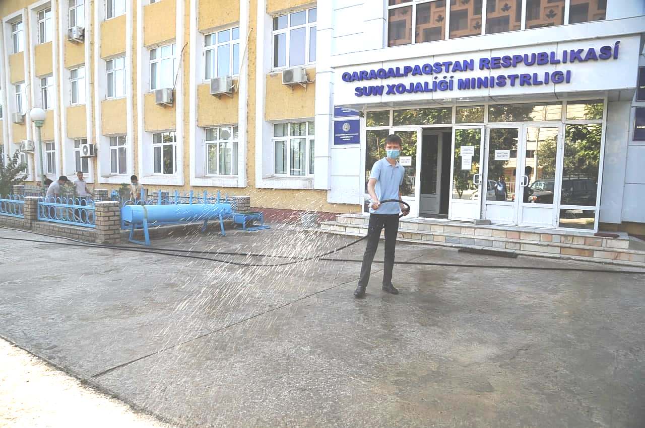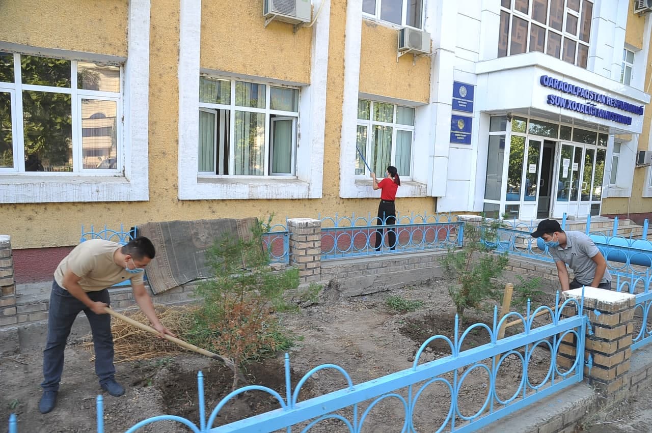 ___Эрта тонгдан Нукус шаҳридаги барча вазирлик ва идора ташкилотлари, ўқув муассасалари жамоалари кўча бўйларини ободонлаштиришга киришдилар. Шу жумладан, Қорақалпоғистон Республикаси Сув хўжалиги вазирлиги маъмурий биноси атрофларига сув сепилиб, ҳовлисидаги дархтларга ишлов берилди.
