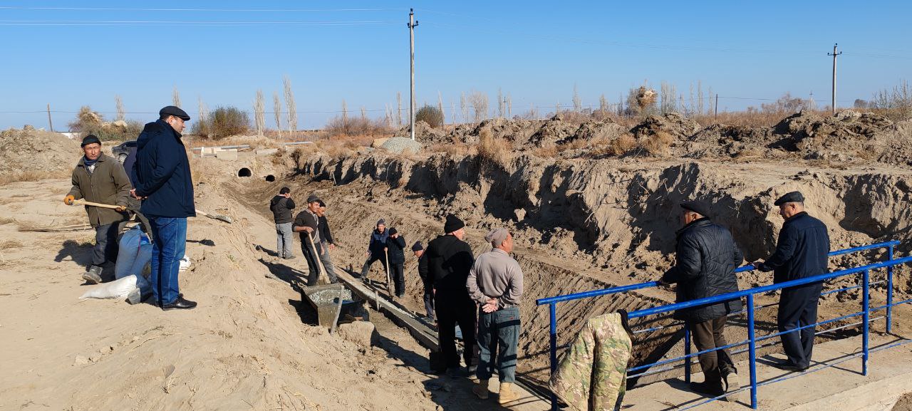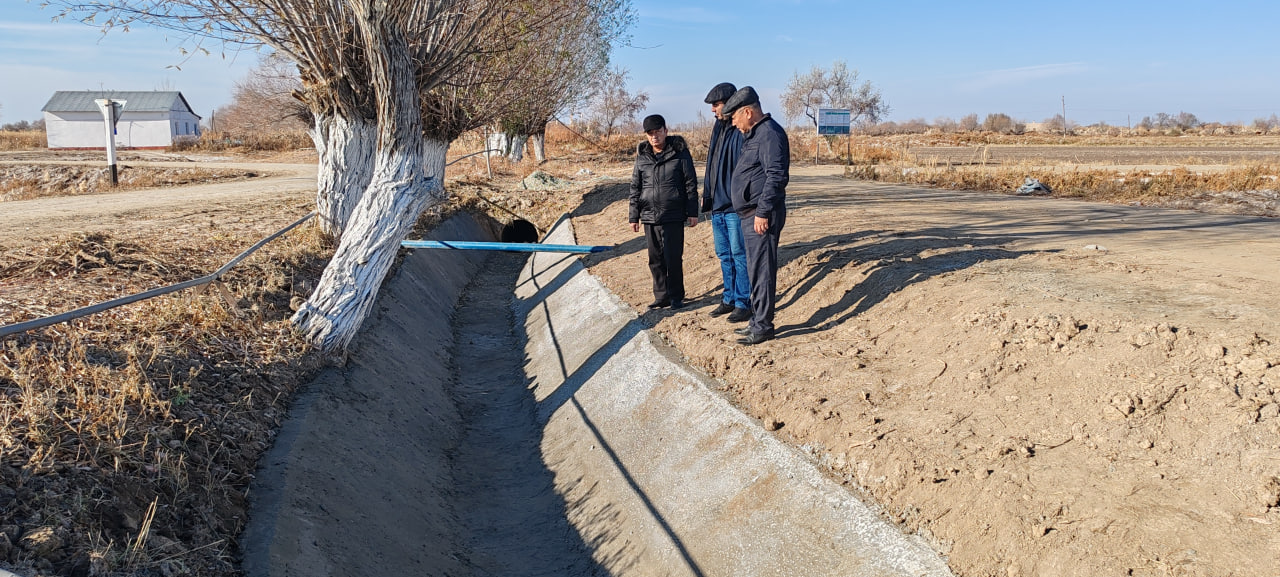 Қорақалпоғистон Республикаси Сув хўжалиги вазири Б.Жузбаев ва Ўзбекистон Республикаси Сув хўжалиги вазирлигининг Сув хўжалигида ислоҳотлар маркази раҳбари И.Жўраев билан биргаликда туманларда суғориш тармоқларини куз-қиш тадбирлари доирасида тозалаш, ички каналларни бетонлаш ишларини жойига бориб ўрганишмоқда.