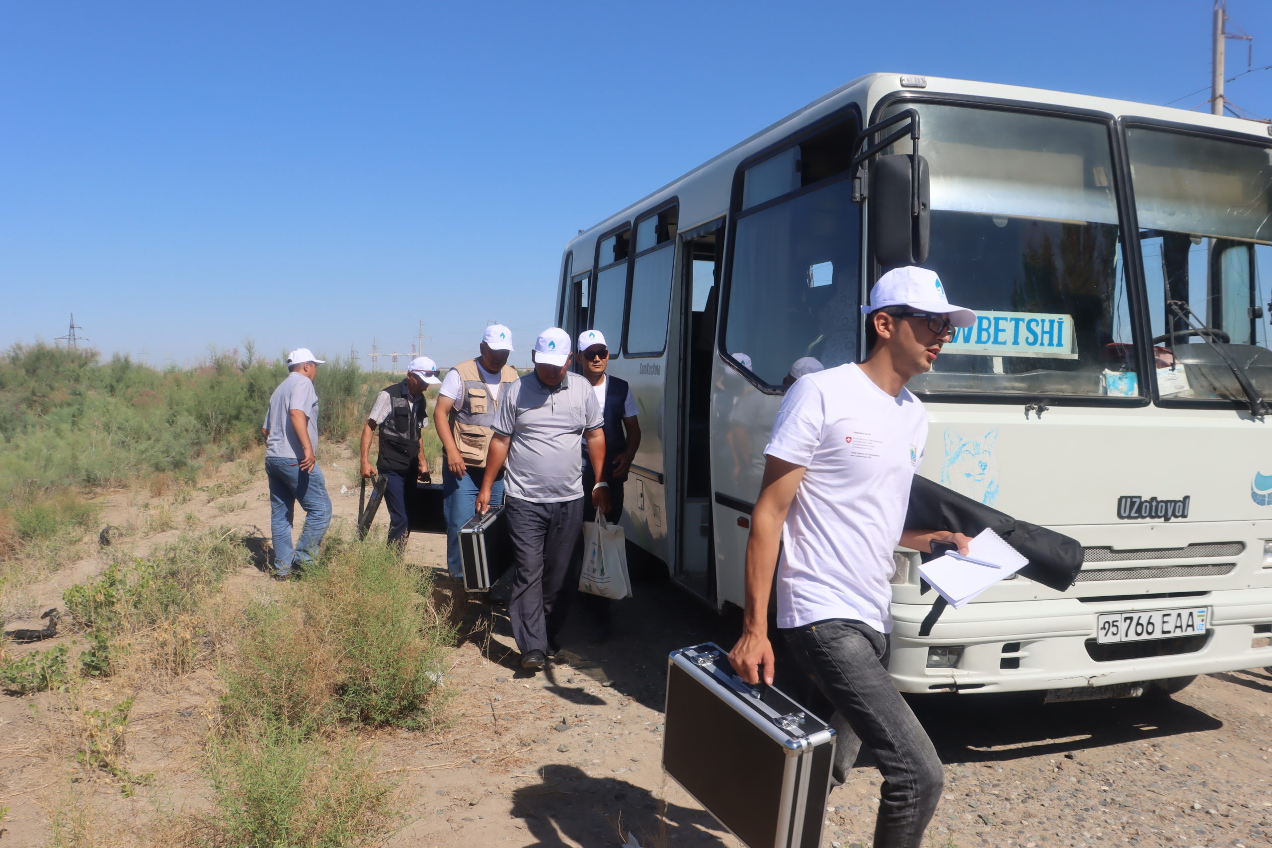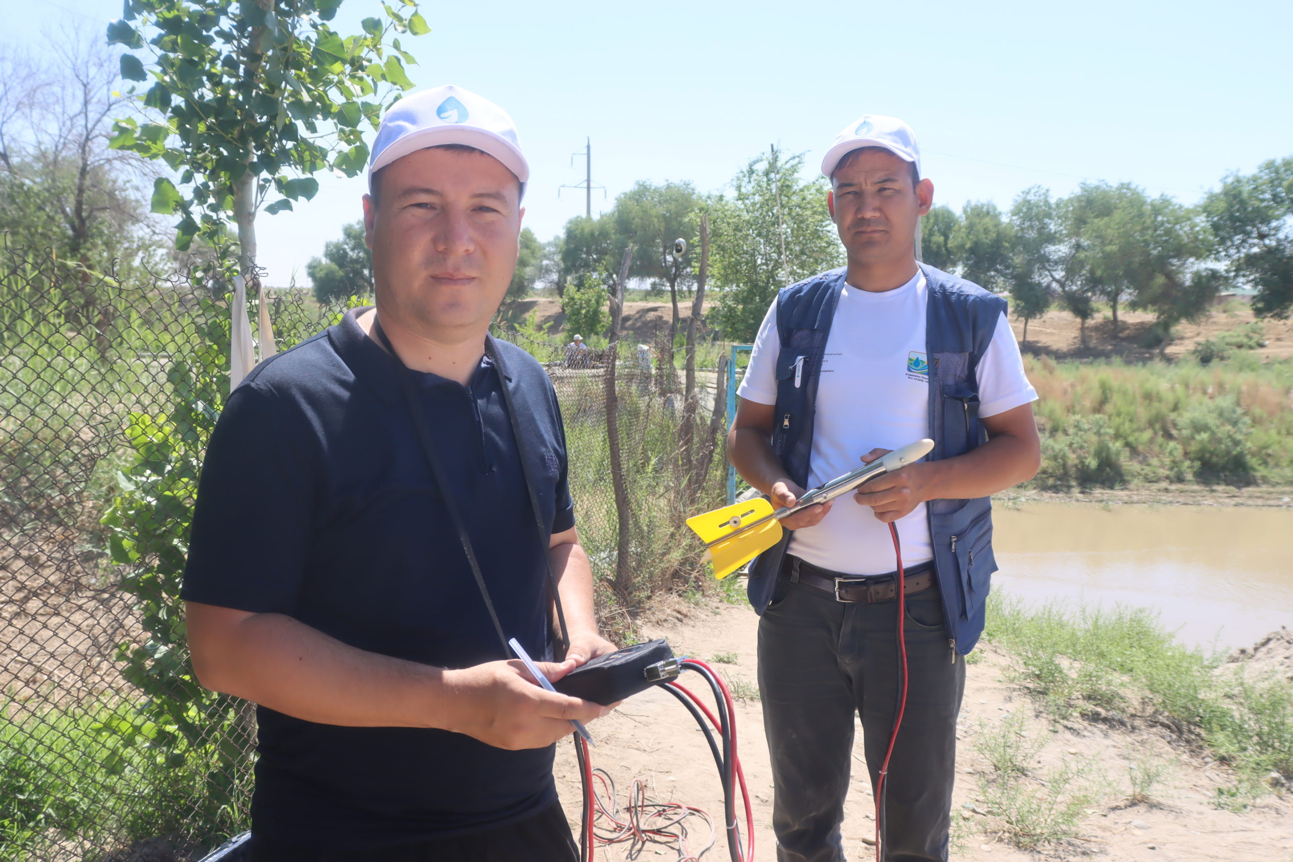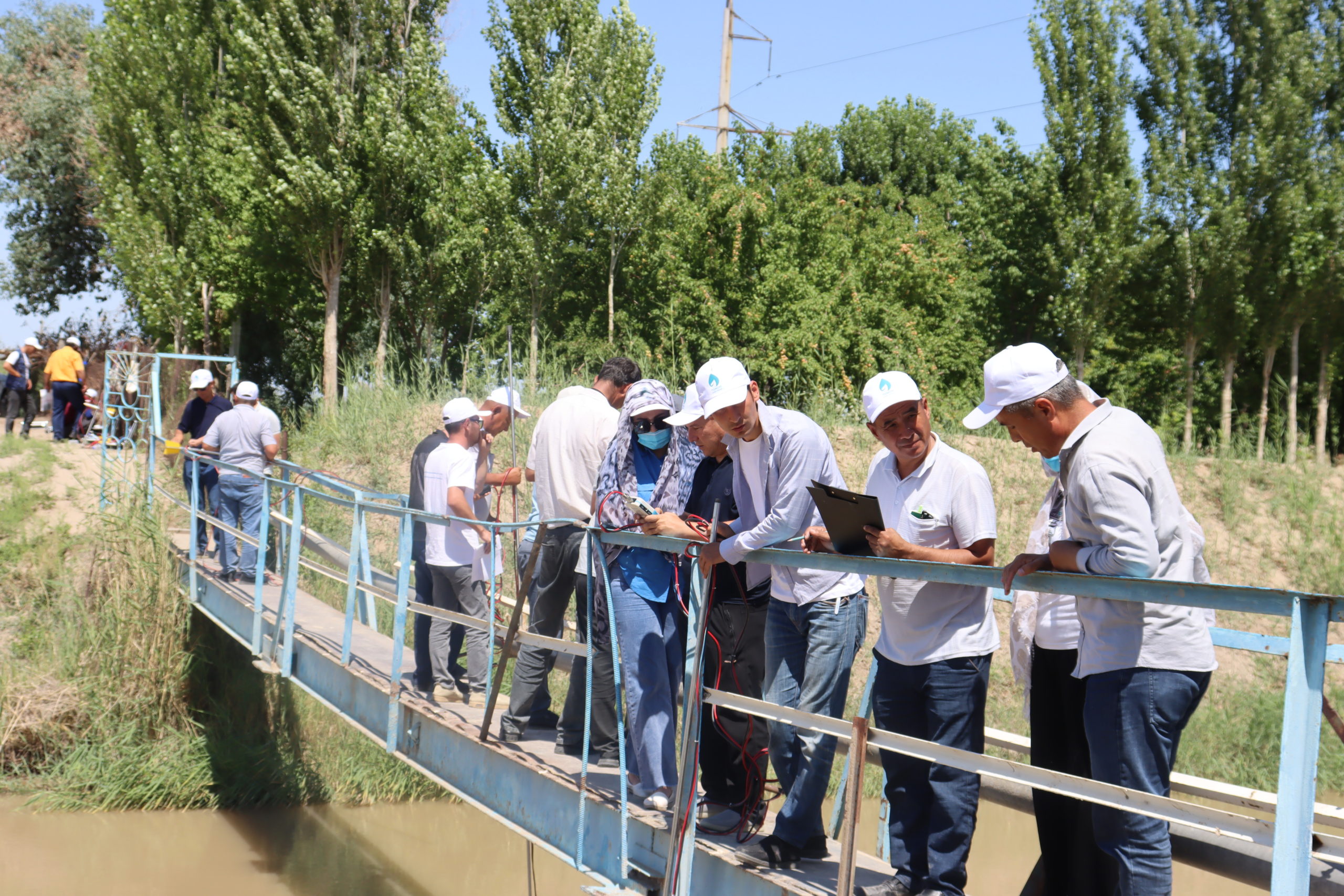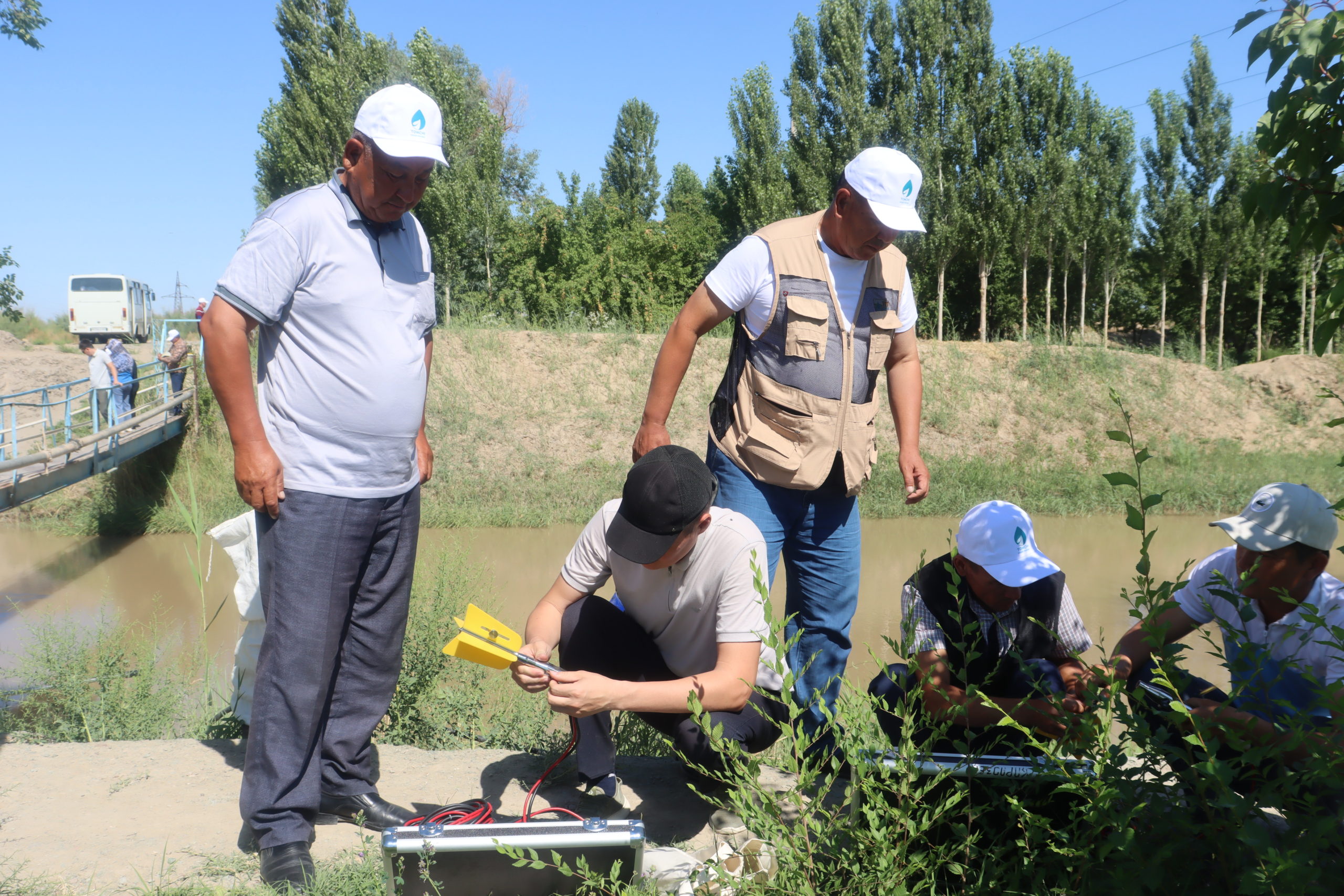 Шундан сўнг, гидрометрлар ўқув курсларини амалиётда синаб кўриш учун Нукус туманидаги “Развилка” сув тақсимлаш иншооти ҳудудига чиқдилар. Ҳар бир ҳудуддан ўқув курсига келган гидрометрлар ўзлари билан лойиҳа доирасида асосида ажратиланган замонавий сув ўлчаш вертушкаларини олиб келишган. Улар ҳудуддаги турли хил ўлчамдаги каналларда тренерлар ёрдамида янги вертушкалар ёрдамида сув миқдорларини ўлчадилар ва натижалари муҳокама қилинди.